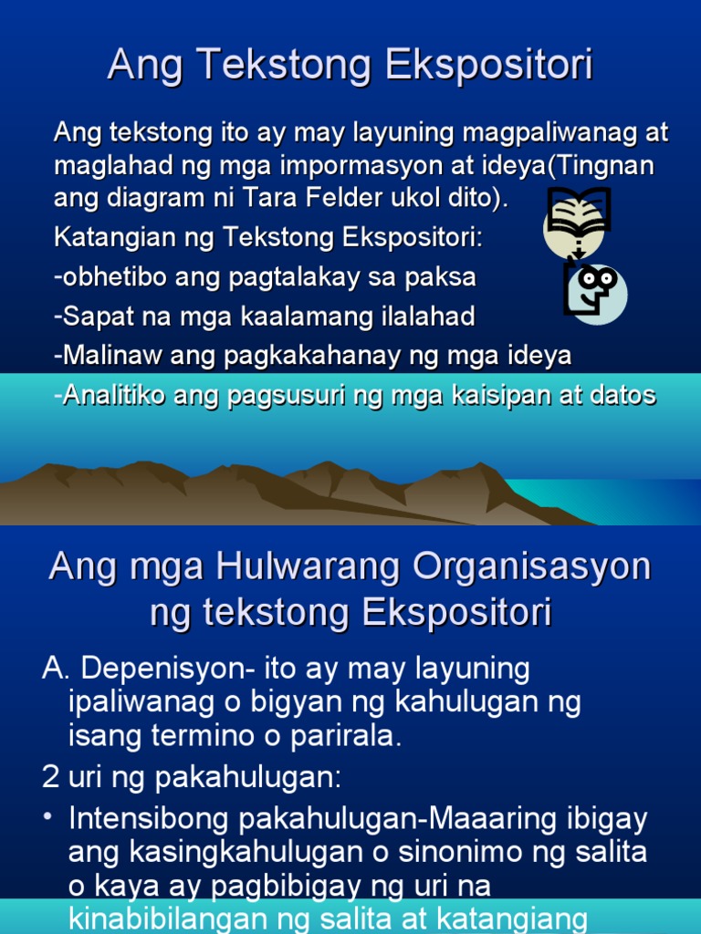 Ang ekspositoryong teksto sa kabilang banda ay umiiral upang makipag-usap ng mga katotohanan sa isang nakapagtuturo at may layunin na pamamaraan. Start studying Ang Tekstong Ekspositori. Isang paalala sa iyo ang naging karanasan mo noong bata ka pa mas mabuting makapagtapos ng pag-aaral ang magiging anak mo.