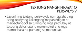 TEXTONG NANGHIHIKAYAT O PERSWEYSIV Layunin ng textong persweysiv na maglahad ng isang opinyong kailangang mapanindigan at maipagtanggol sa tulong ng mga patnubay at totoong datos upang makumbinsi ang mga mambabasa na pumanig sa manunulat. Human translations with examples. Iba pang halimbawa ng Tekstong Persweysib-Editoryal -Talumpati-Sanaysay -Slogan o catch phrase-Patalastas sa radyo at telebisyon-Brochure -Catalog Ang tekstong persuweysib ay naglalaman ng mga sumusunod.