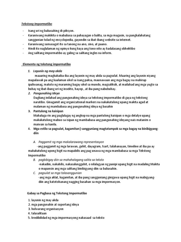 Elemento ng Tekstong Impormatibo. Kabilang sa mga ito ay ang mga kuwentong nagsasalaysay ng mga tunay na pangyayari at mga babasahing mayroon tayo sa paaralan tulad ng mga teksbuk o batayang aklat. Ano ang Tekstong Impormatibo.