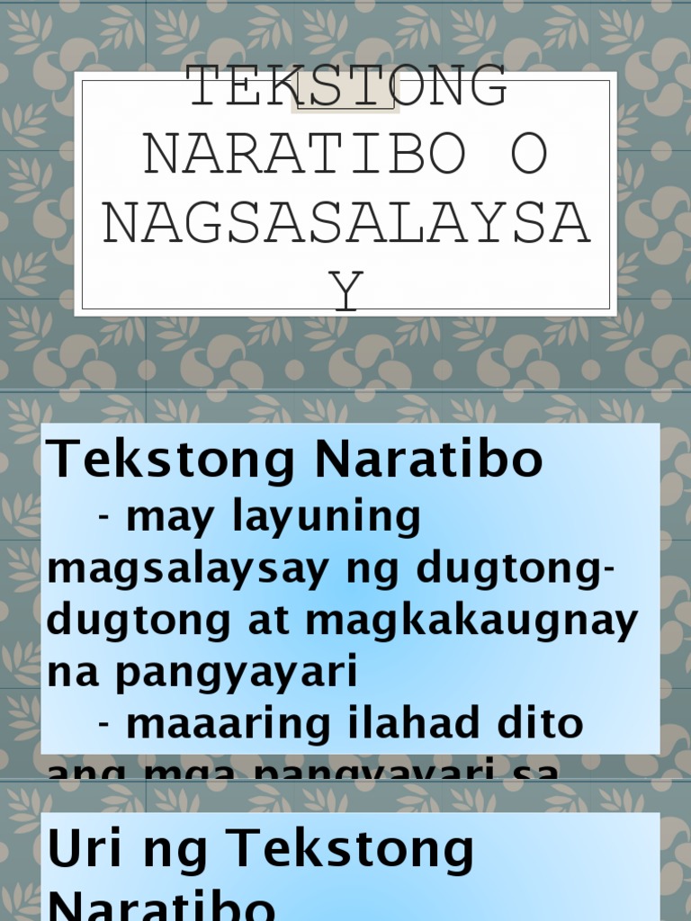 Ang Tekstong Narativ o Pagsasalaysay. Save TEKSTONG NARATIBO For Later. Bihirang-bihirang magamit ang ikalawang.