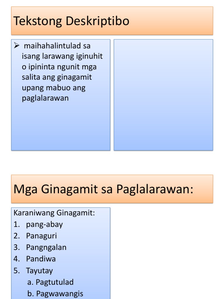 Kung ang lugar na inilalarawan ng isang. Dahil naglalarawan ang mga tekstong deskriptib mayaman ang mga ito sa mga pang-uri at pang-abay. Ang tekstong ito ay laging sumasagot sa tanong na Ano.