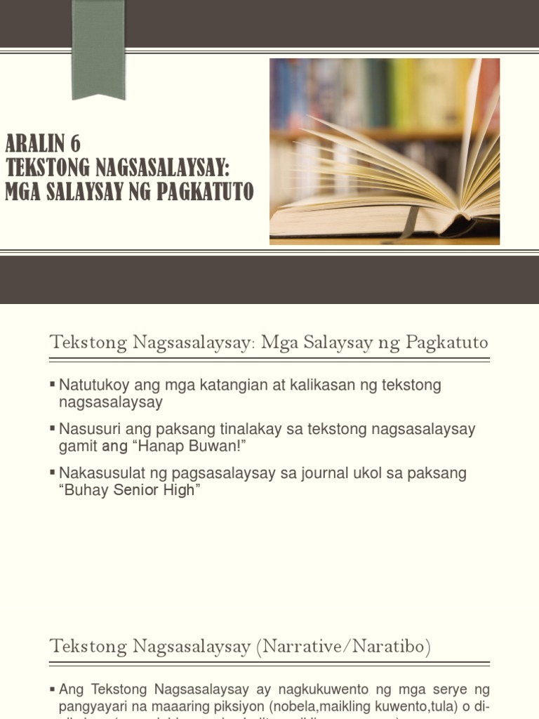 Ang uri ng tekstong naglalahad ng mga impormasyon tungkol sa maraming bagay na may pinagbabatayan. -Ang tekstong naratibo ay ginagamit din sa mga ulat na naglalahad ng mga aktibidad ng isang kumpanya o organisasyon testimonya ng saksi sa isang krimen o pangyayari tala o record ng mga obserbasyon ng isang doctor puna o mungkahi ng guro sa report card ng estudyante at iba pang katulad nito. Ito ang tauhang nagtataglay na predictable na kaugalian o reaksyon.