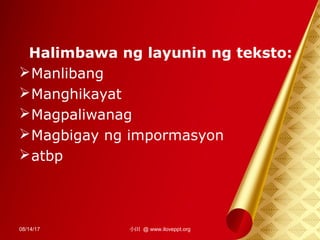 HALIMBAWA NG TEKSTONG DESKRIPTIBO 14. Hinihikayat din nito ang mambabasang tanggapin ang posisyong pinaniniwalaan o ineendorso ng teksto. Ang layunin ng tekstong persuweysiv ay ang manghikaya o mangumbinsi sa babasa ng teksto.