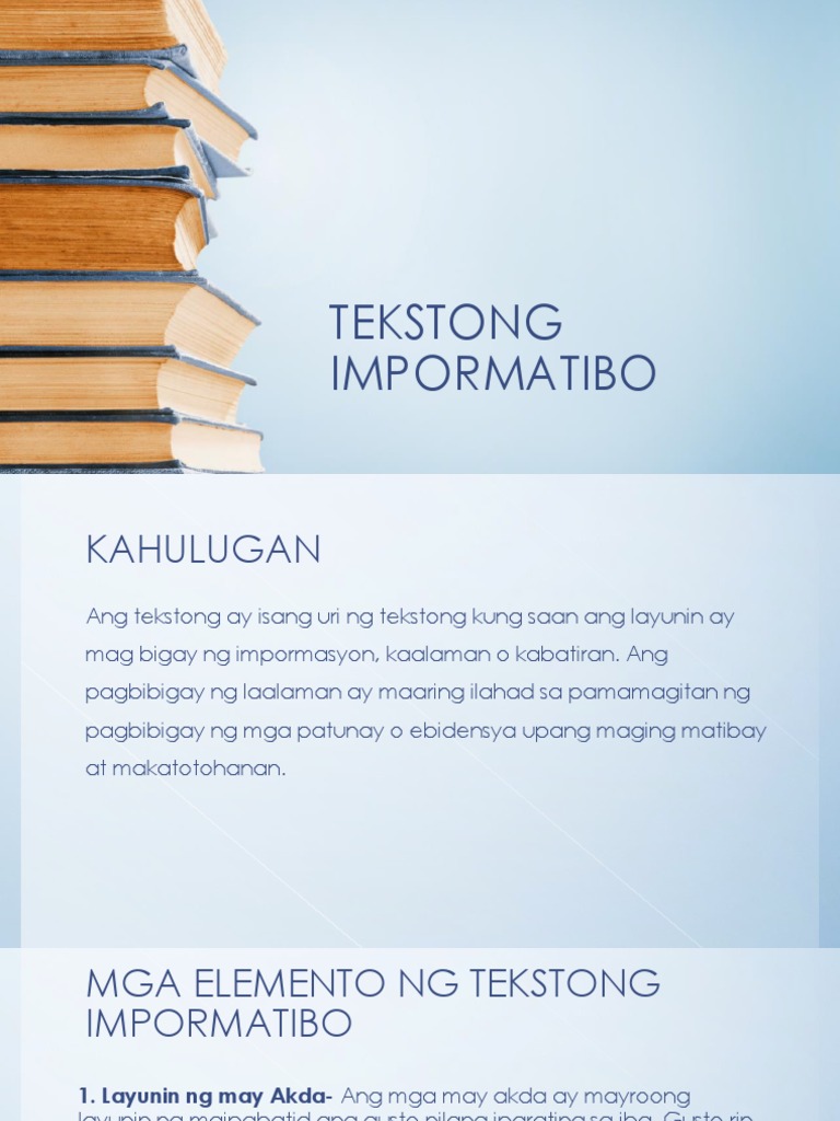 Aklat tekstong impormatibo. Sa pag-aaral na ginawa niya ang dahilan kung bakit hindi gaanong nakapagbabasa ng tekstong impormatibo ang mga mag-aaral ay dahil limitado ang ganitong uri ng mga babasahin sa kanilang lugar. Pagbasa 11 Kwarter 3 Mod2 Tekstong Deskriptibo v3. Ito rin ay kadalasang sumasagot sa mga tanong na ano sino at paano tungkol sa isang paksa.