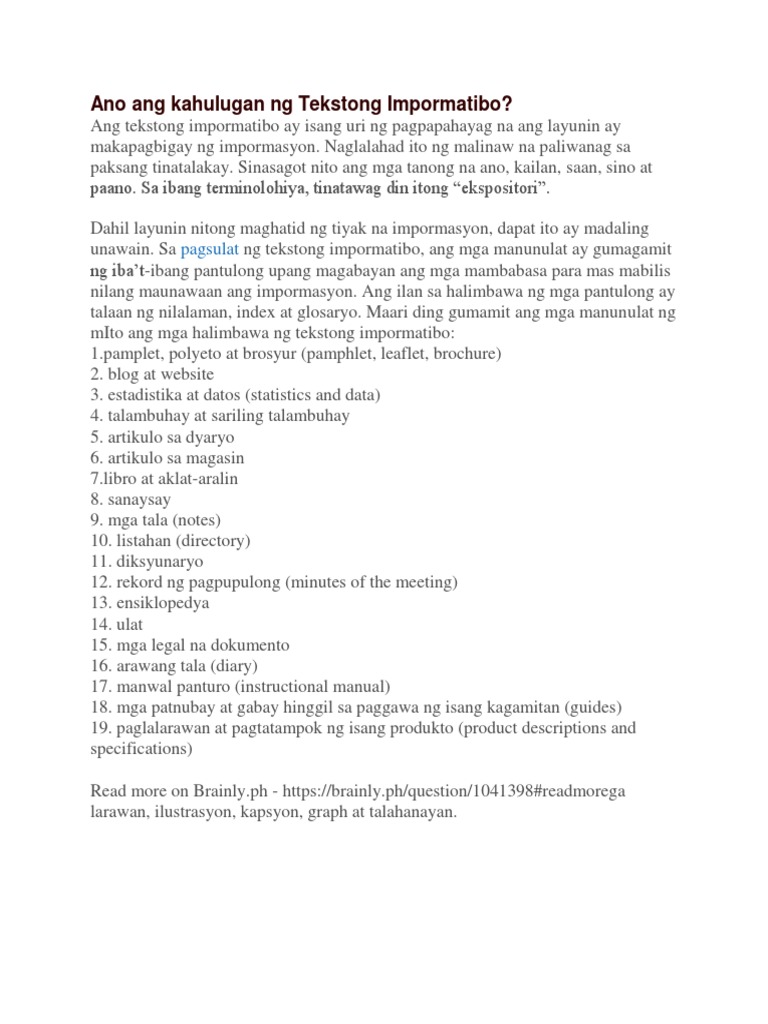 Ang tekstong importmatibo ay brainly. How to get repeat customers. Ang nilalaman nito ay mula sa mga aktuwal na datos katotohanan o pangyayari. Sa araling ito ay tatalakayin natin ang tekstong.