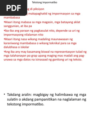Ano ang mga naitutulong ng mga tekstong biswal. Ito ay nagpapaliwanag at nagbibigay linaw tungkol sa ibat ibang paksa. Ang sining ay tumutukoy sa malawak na saklaw ng mga gawain ng mga tao na nagpapahayag ng mga biswal pandinig at iba pang uri ng obra na nagpapahayag ng iniisip o nararamdaman ng gumawa. Good dayAng Tekstong impormatibo ay isang uri ng teksto na may layuning magbigay ng impormasyon.