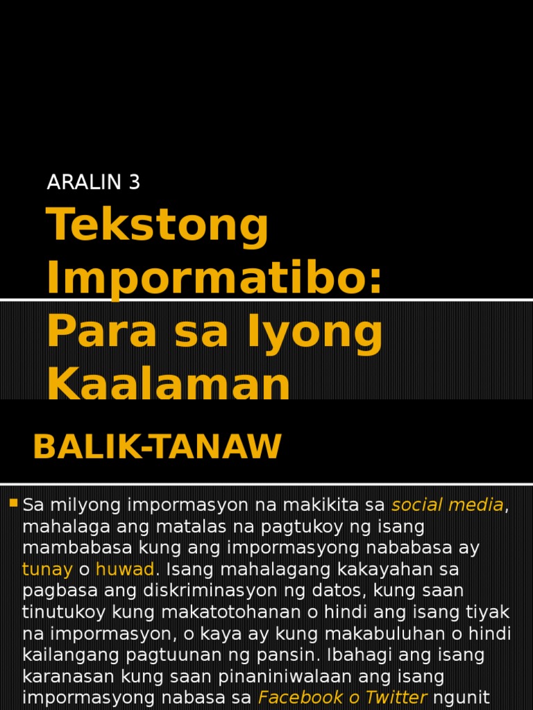 Aralin 3 Tekstong Impormatibo Para sa Iyong Kaalaman Tekstong ImpormatiboEkspositori Isang anyo ng. Pagtalakay sa Katangian at Kalikasan ng Ibat Ibang Uri ng Teksto 1. Ang tekstong impormatibo ay isang uri ng pagpapahayag na ang layunin ay makapagbigay ng impormasyon.
