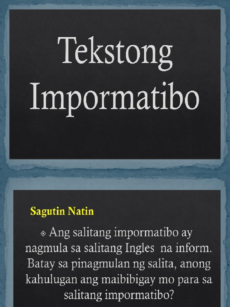 Ano ang kahulugan ng Tekstong Impormatibo. Kadalasang sinasagot nito ang mga batayang tanong na ano kailan saan sino at paano.