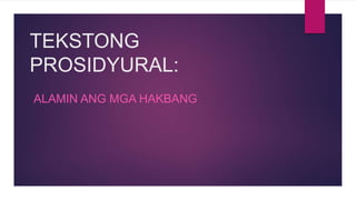 2 Ano ang mga dapat isaalang-alang sa tekstong prosidyural. TEKSTONG PROSIDYURAL Uri ng paglalahad na kadalasang nagbibigay ng impormasyon at instruksyon kung paanong isasagawa ang isang tiyak na bagay. LAYUNIN NG TEKSTONG PROSIDYURAL Ang layunin ng tekstong prosidyural ay makapagbigay ng sunod-sunod na direksyon Ingles.