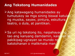 Humanidades ay ang mga larangan na nag-aaral sa kultura at lipunan ng tao. Ang tekstong humanidades ay nagmula sa salitang Humanus na ang ibig sabihin ay tumulong sa tao. Start studying 12-14 TEKSTONG HUMANIDADES SIYENTIPIKO AT AGHAM PANLIPUNAN.