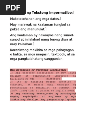 Contrasting ng impormasyon 6. Pagsusuri o deduksyon 3. Ang tekstong deskriptibo ay nagtataglay ng mga kaukulang detalye sa katangian ng isang tao lugar bagay o pangyayari.