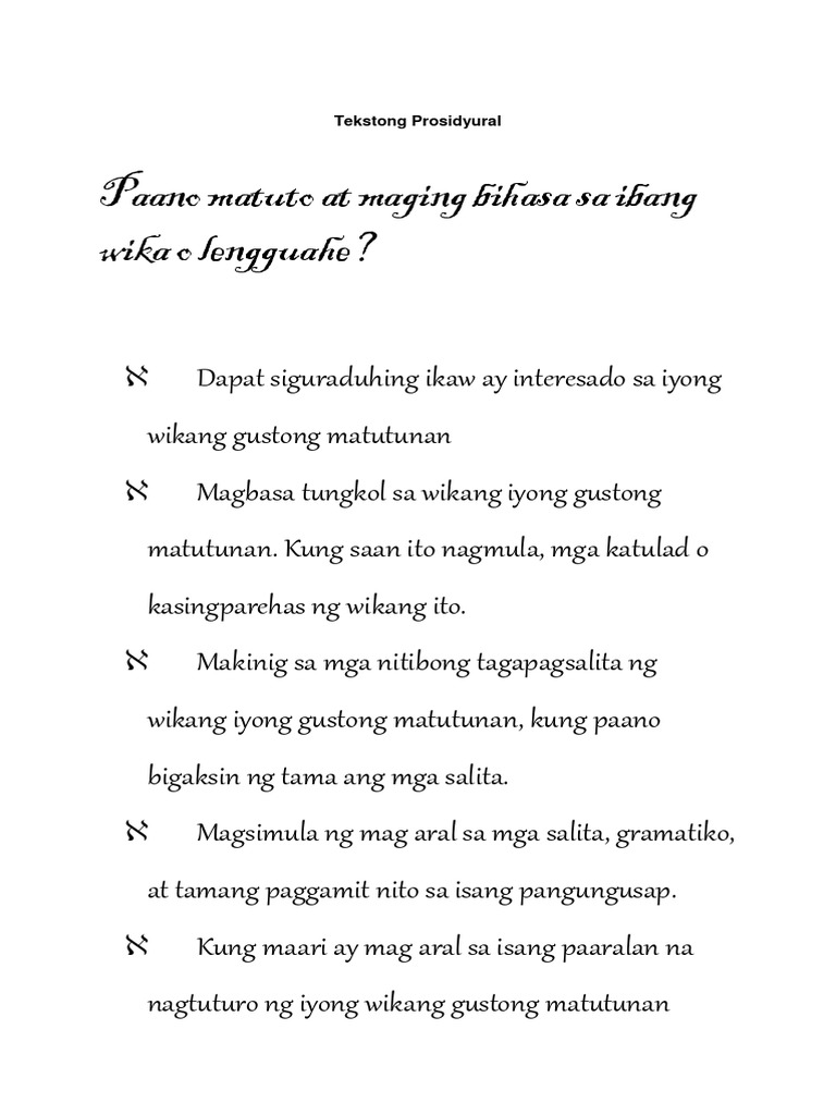 -- 4 na patpat ng kawayan 14 pulgada ang lapad at 3 12. Natutukoy ang relasyon ng teksto sa sumulat sa tulong ng mga tiyak na bahagi. Mga Halimbawa Ng Tekstong Prosidyural.