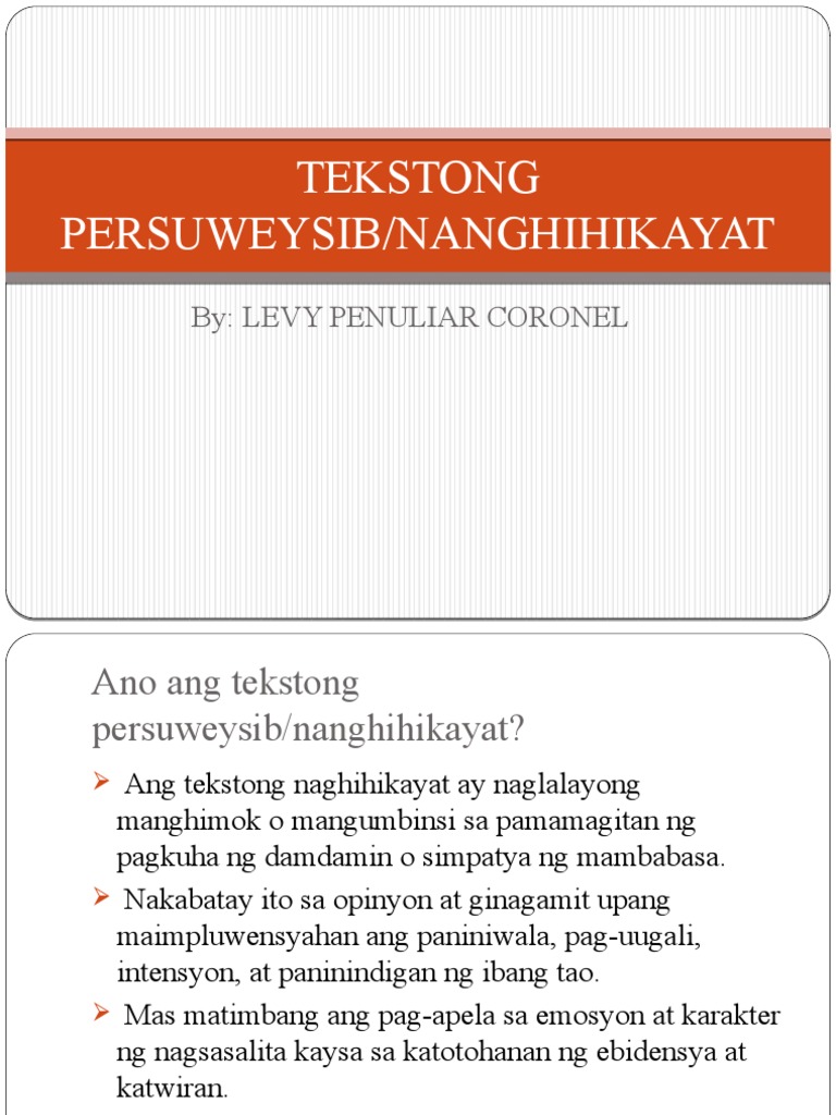 Ang mapanghikayat na pagsulat ay isa kung saan ang may-akda ay naglalahad ng impormasyon patunay o pangangatwiran upang hikayatin ang mambabasa na paniwalaan ang. TEKSTONG PERSWEYSIB Sa paksang ito ating tatalakayin kung ano nga ba ang tekstong persweysib at ang mga halimbawa nito. Kinakailangang may matibay na ebidensya ang manunulat upang mapatunayan ang.