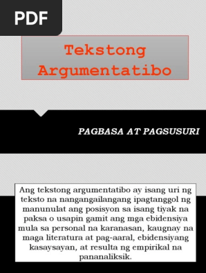 Ito ang thesis statement o ang paksang ibibigay sa unahan ng may-akda upang magbigay ng kuwarto para sa. Ang argumentatibo at persuweysib ay dalawa lamang sa mga uri ng teksto. Mapatunayan ang katotohanan ng ipinahahayag at ipatanggap sa.