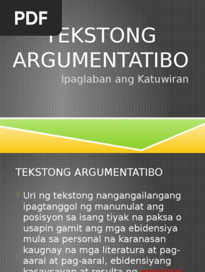 Sa wakas naman mahalagang muling ipagdiinan ng manunulat ang kanyang proposisyong binanggit sa panimula upang matiyak na. Ang tekstong argumentatibo ay isang uri ng teksto na nangangailangang ipagtangol ng manunulat ang posisyon ng isang tiyak na paksa o usapin gamit ang mga ebidensya mula sa personal na karanasan kaugnay ang mga literatura at. 3 Dis 2009.